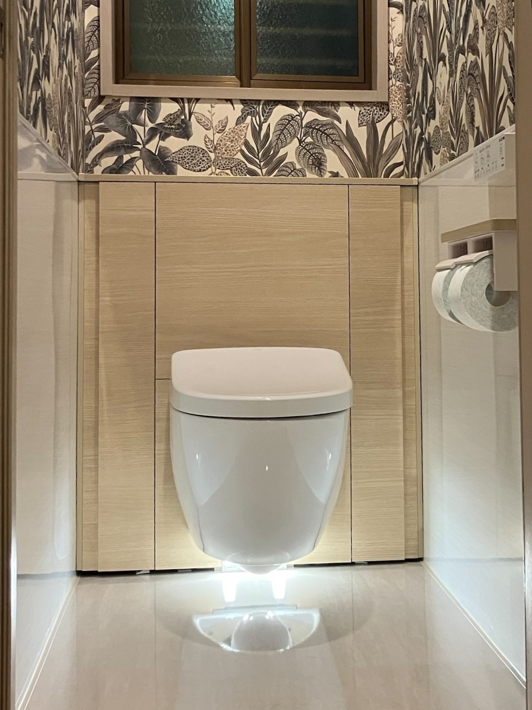 フローティングデザイン+内装一新+フロアライト設置で、お掃除しやすく明るく安心できるトイレ空間になりました。